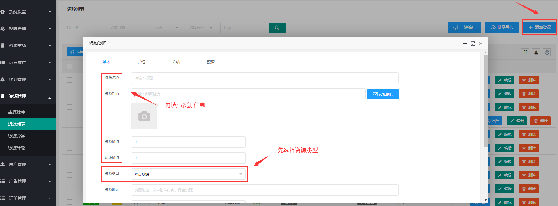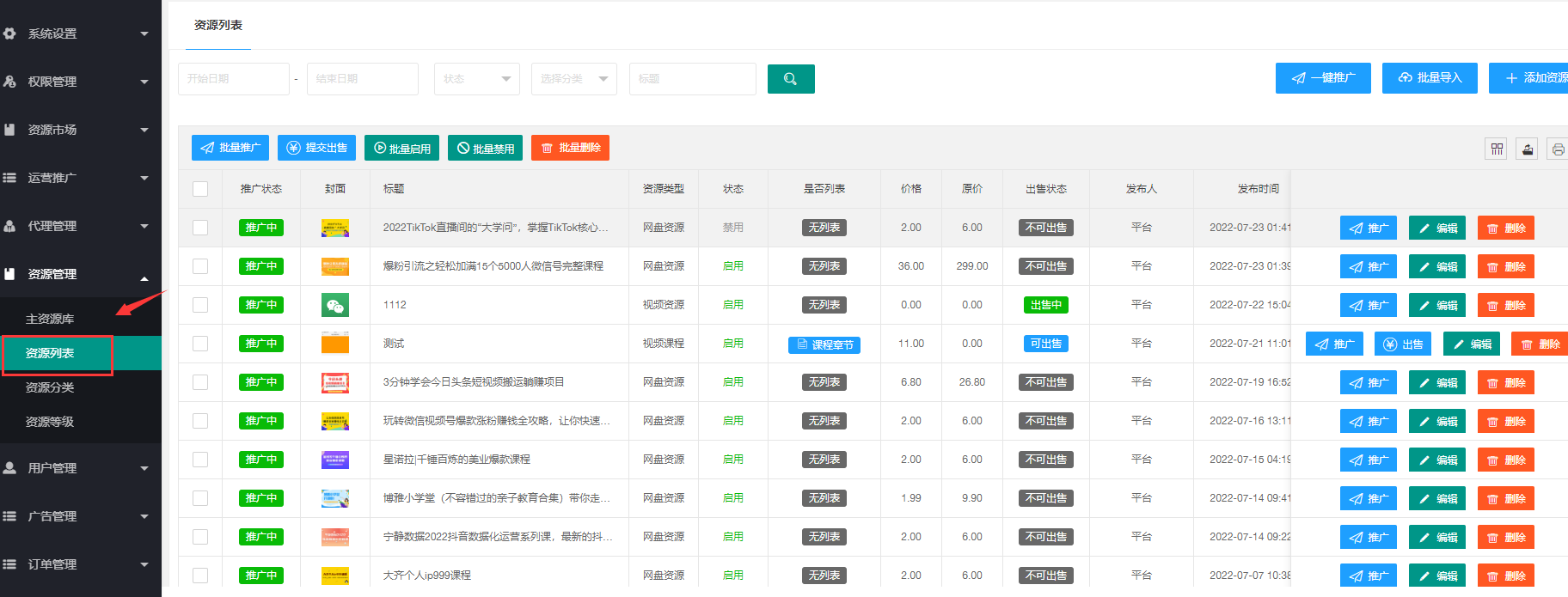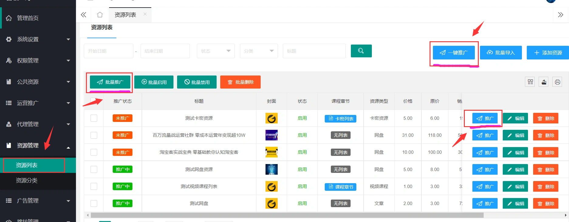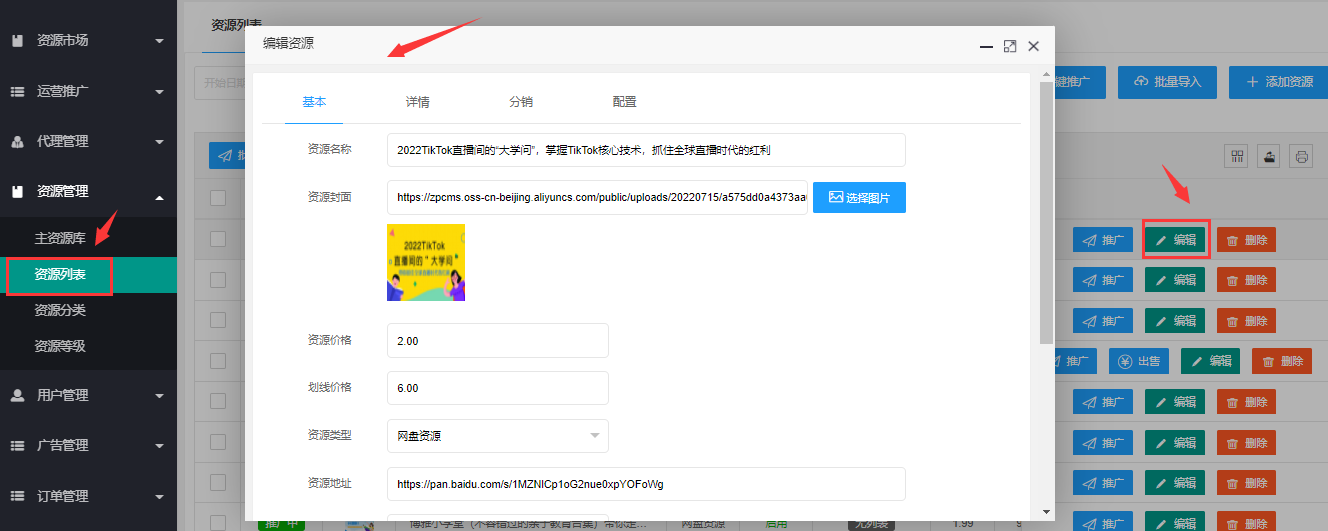 > 2.4.2、如果需要在【**资源列表**】更新**价格及资源类型**,请在【**推广中心**】删除此资源后点击【**推广**】按钮。
