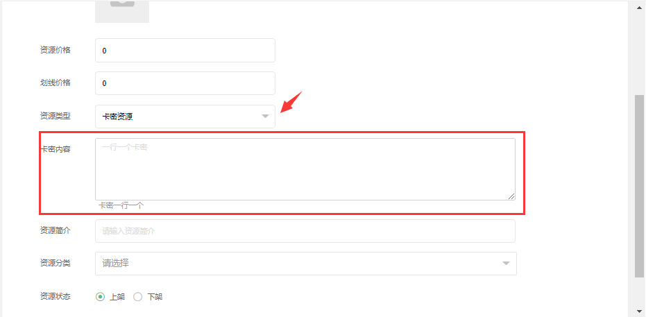 > 1.1.6、**卡密资源**(适用于软件的激活码、序列号等):一行一个卡密