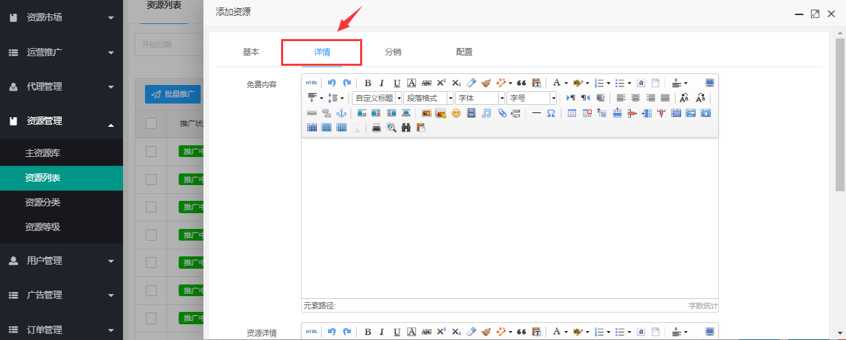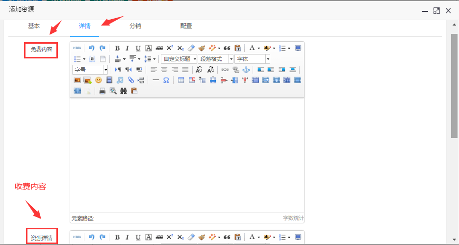 > 1.3、**详情**:免费内容(文章资源需要填写)、资源详情 (前端所展示的资源内容)