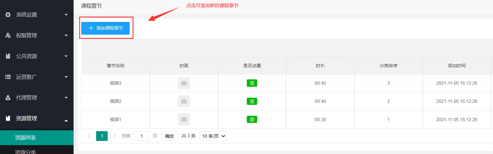 > 2.2、视频课程、音频课程的**章节列表**编辑在资源列表,点击**课程章节列表**按钮