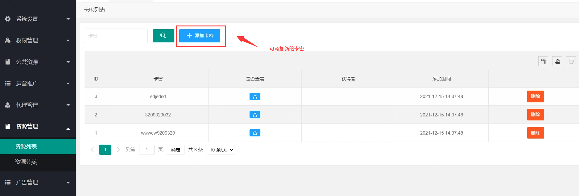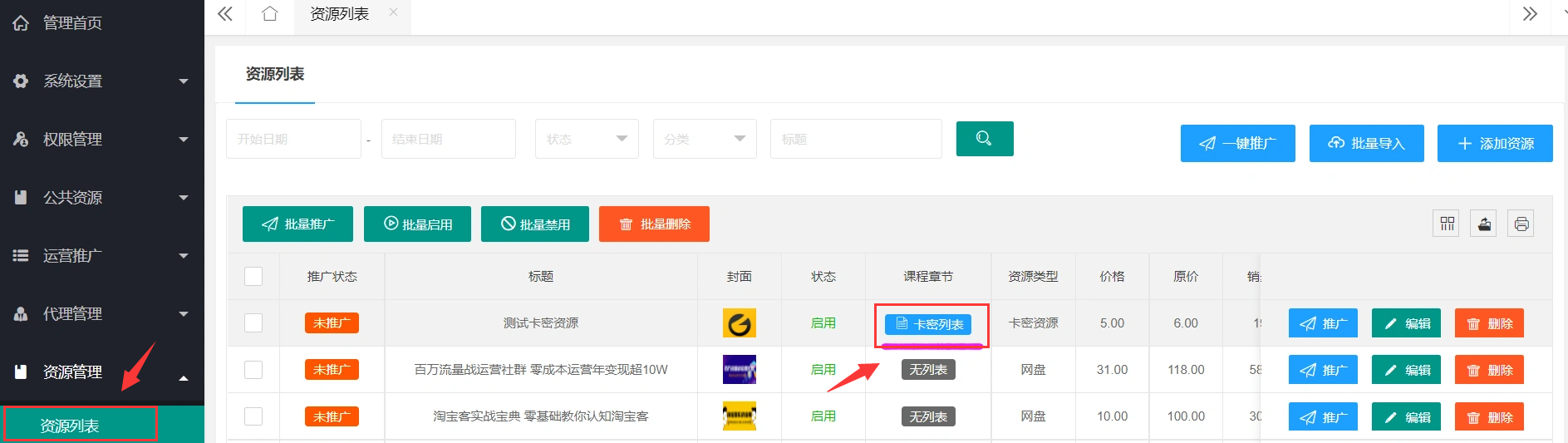 > 2.3、卡密资源的**卡密列表**编辑在资源列表,点击**卡密列表**按钮