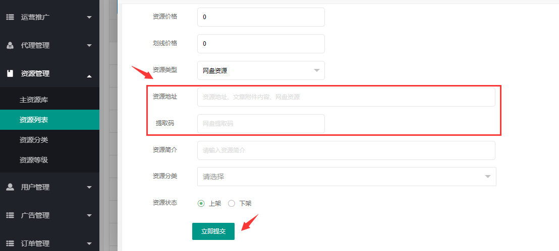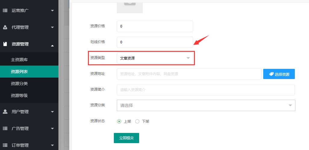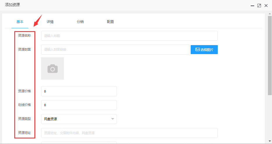 > 1.2、**基本**:标题、封面、资源价格(优惠价)、划线价格(原价)、资源简介、资源分类、资源状态,自行编辑