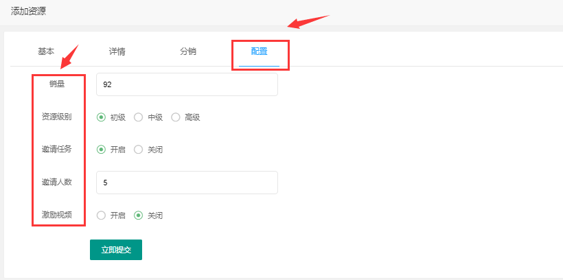 > 1.5、**配置**:销量、资源级别、邀请任务、激励视频(需要开通微信流量主):建议未开通流量主之前关闭激励视频