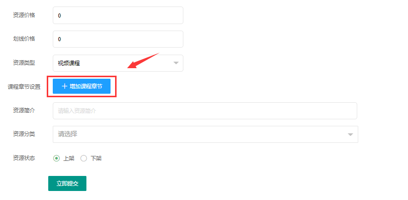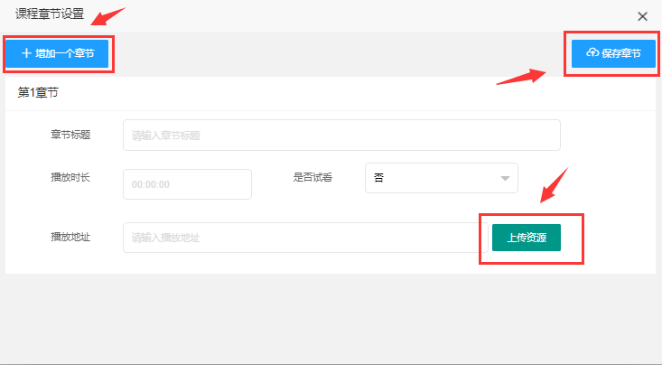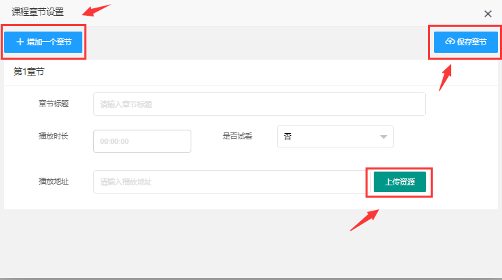 > 1.1.4、**视频课程**:点击增加课程章节 ,可对课程内容进行编辑