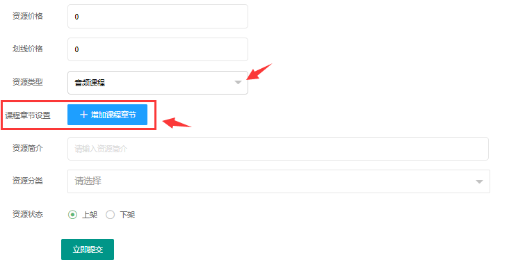 > 1.1.5、**音频课程**:同理,资源类型选择音频课程,点击增加课程章节 ,编辑课程内容