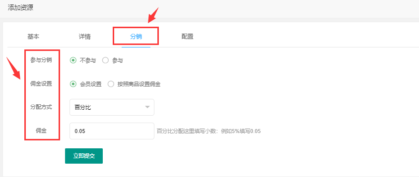 > 1.4、**分销**:参与分销、佣金设置、分配方式、佣金