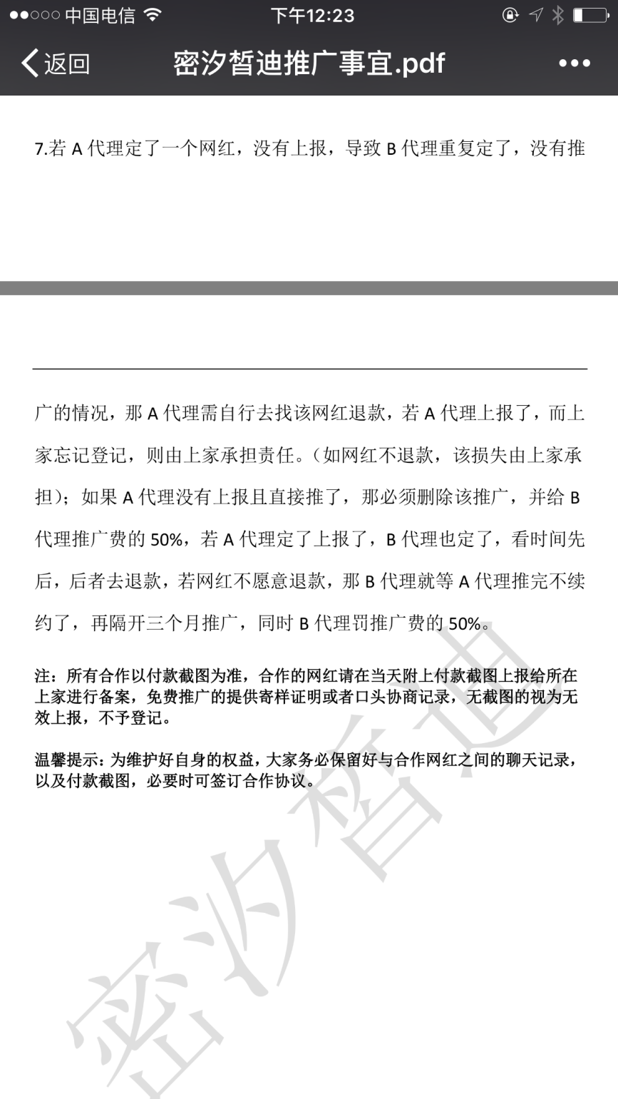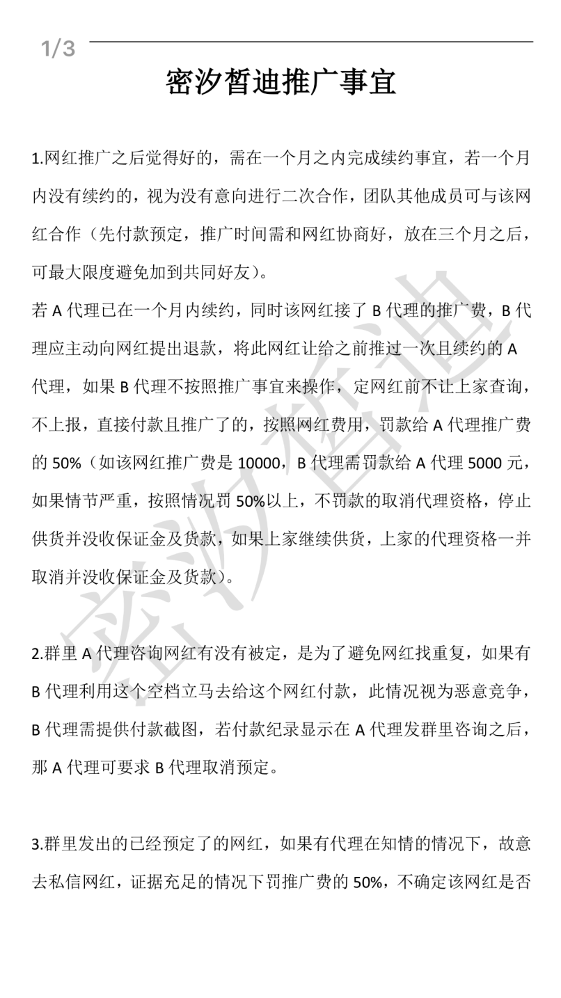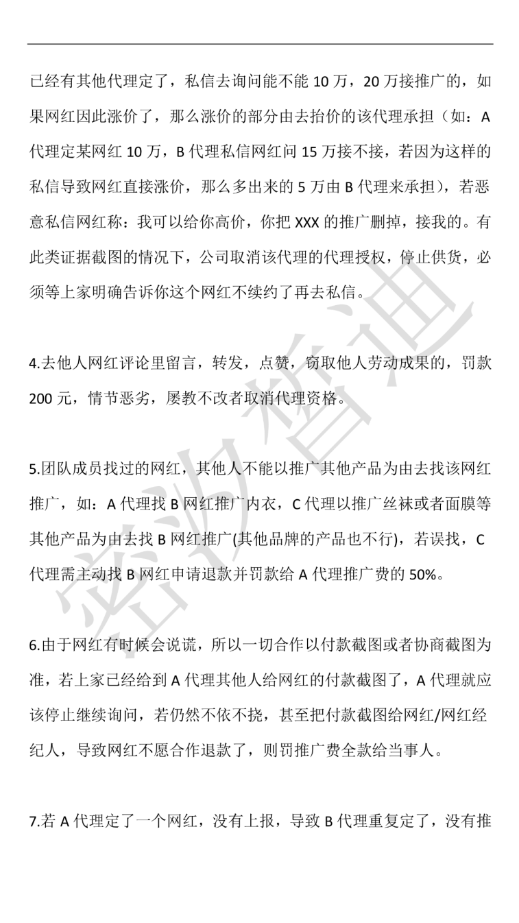 我跟你说一下这个代理规则吧,因为咱们公司属于比较正规的,然后控价这方面也比较严格,一些规则你要熟悉一下,不然犯错了要罚款哦,你好好看看,我发给你