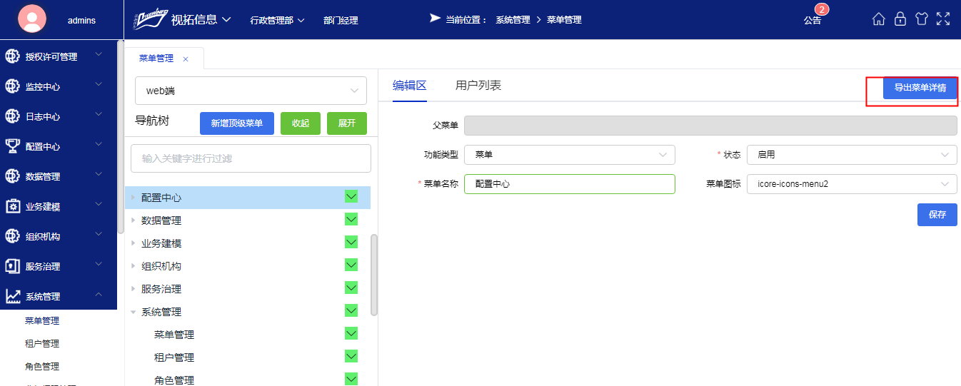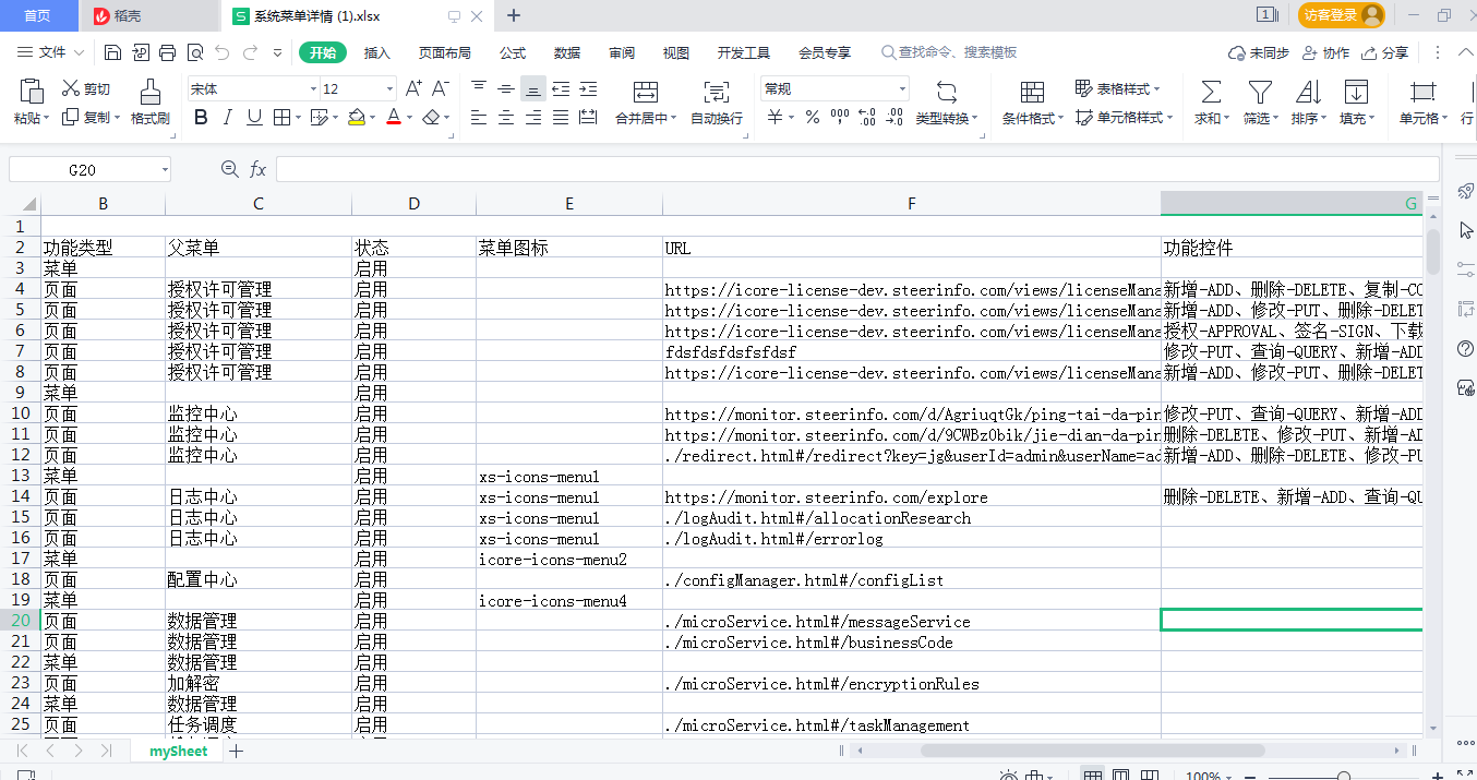 点击“导出菜单详情”按钮;可以把所有菜单以excel文档下载查看详情;如下图所示: