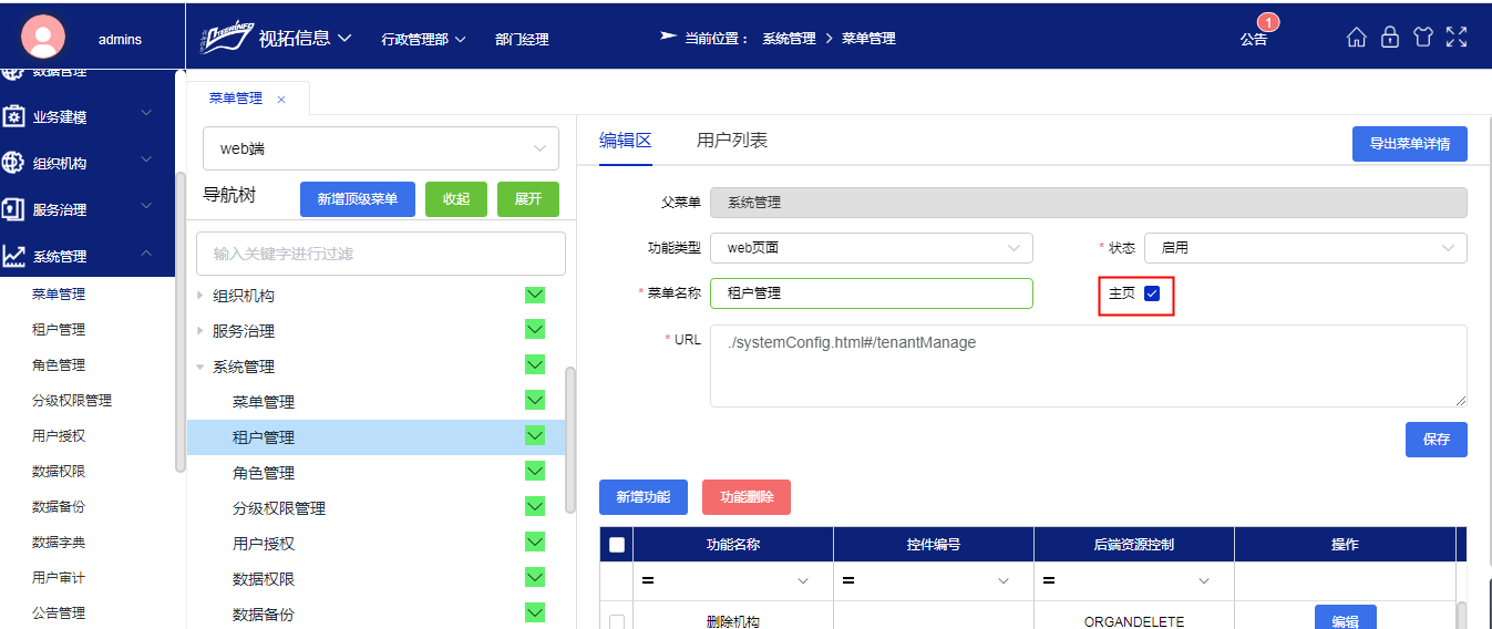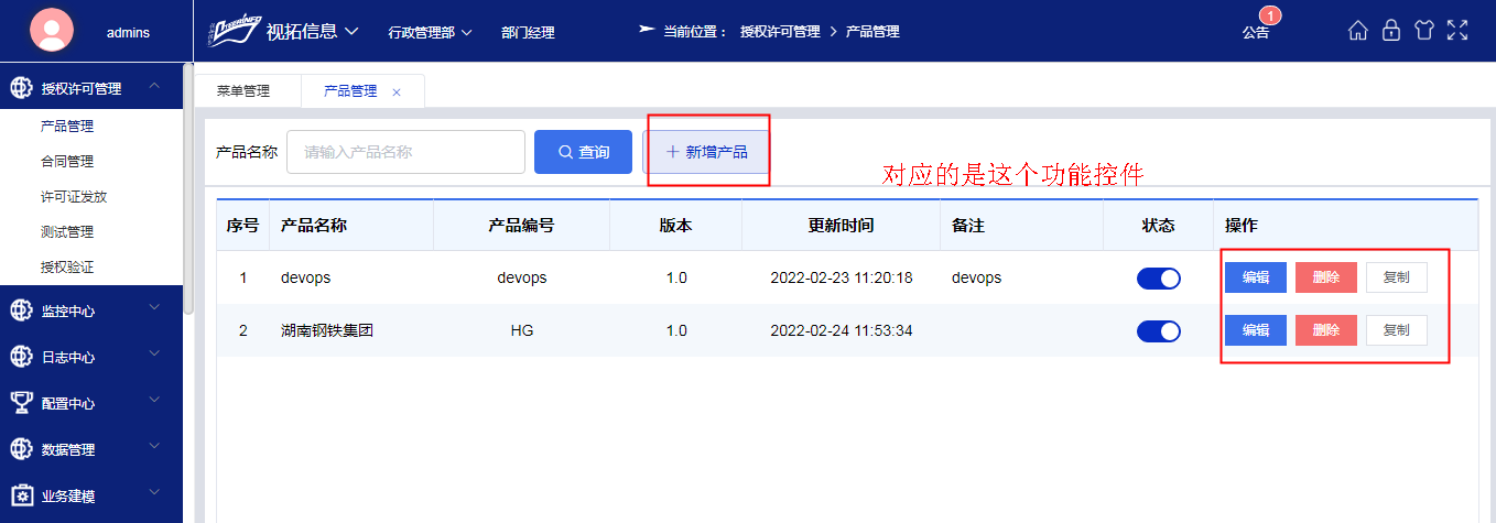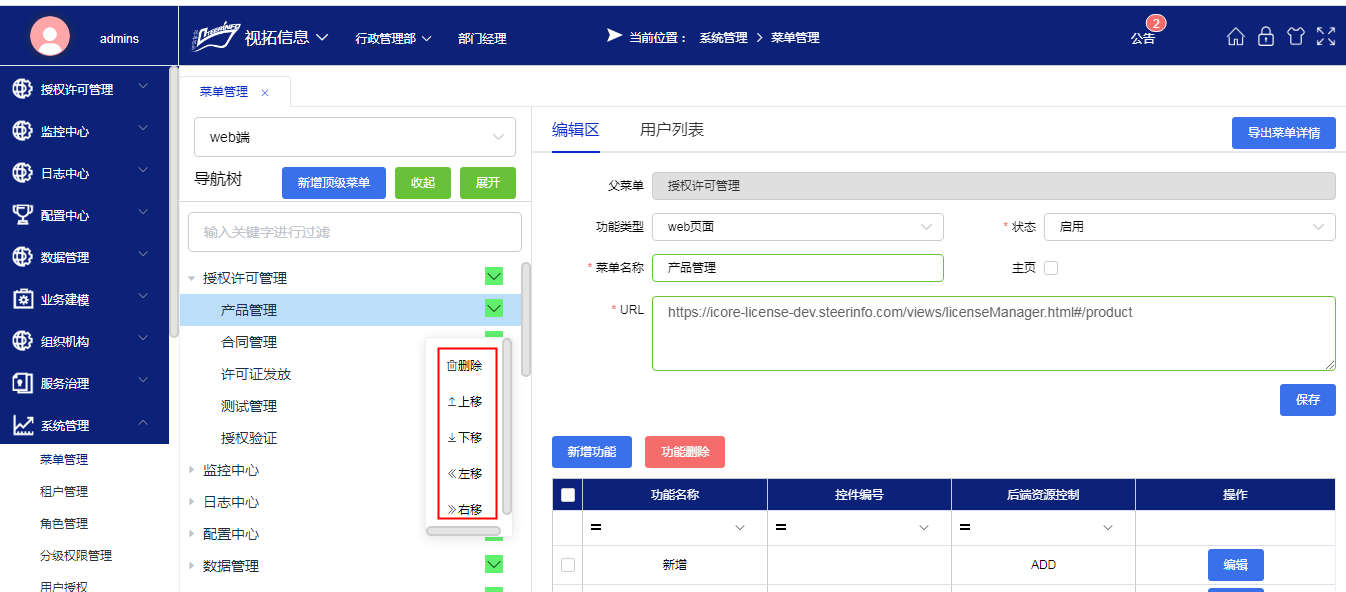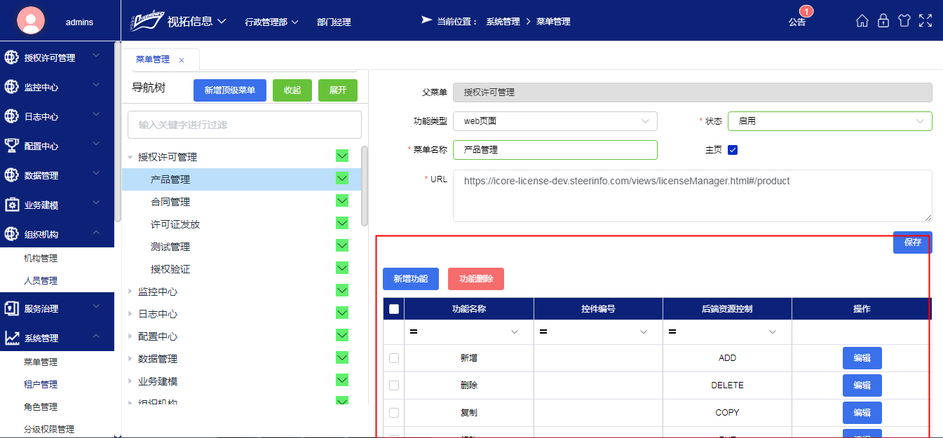 是控制菜单模块界面的按钮功能控件;可以新增、编辑、删除控件;如下图所示: