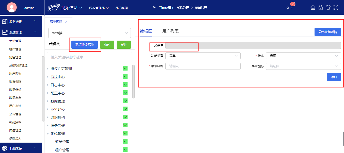 进入菜单管理,点击“新增顶级菜单”按钮进行新增;顶级菜单是没有父菜单;如下图所示: