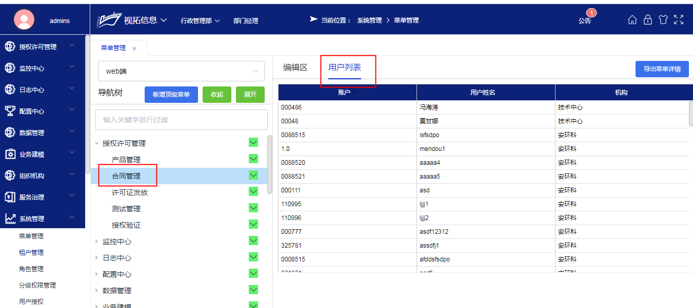 选择一个菜单,可以查看菜单详情;在用户列表可以查看对哪些用户已经授权了该菜单的权限;如下图所示: