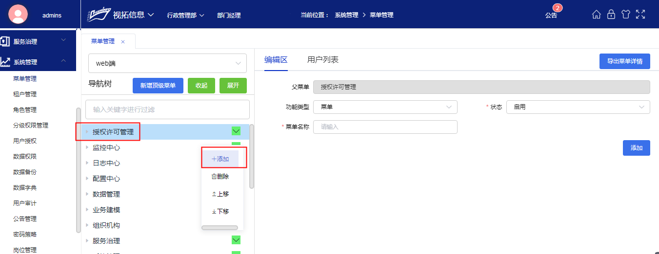 添加子菜单,先选择父菜单,再点击“添加”按钮;如下图所示: