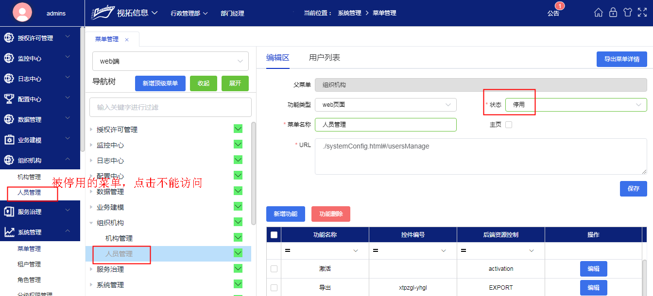 被禁用的菜单,菜单名称会是暗灰色,且在菜单导航栏点击访问没任何反应;如下图所示: