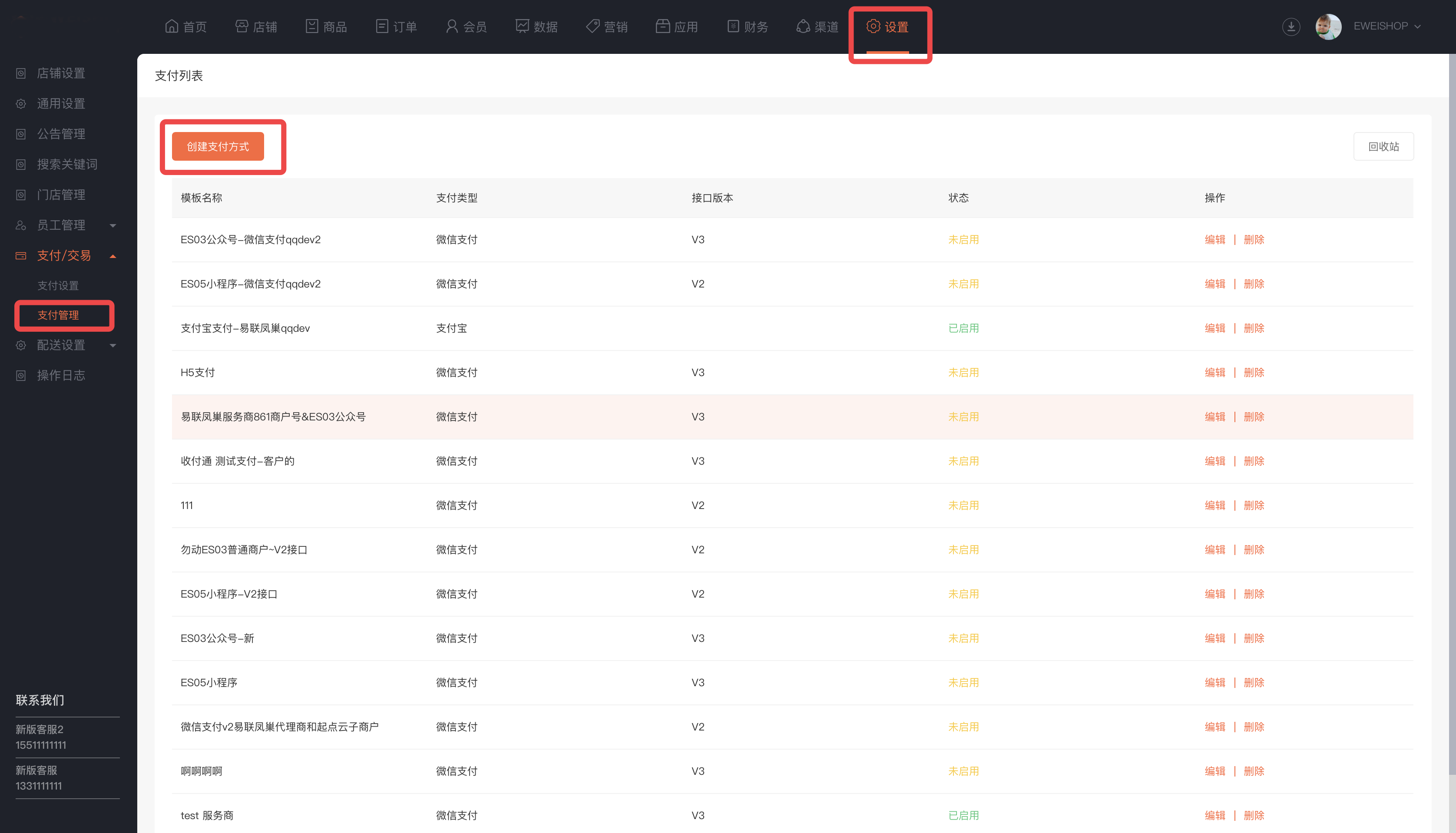 路径:设置 - 支付/交易 - 支付管理 - 添加支付方式