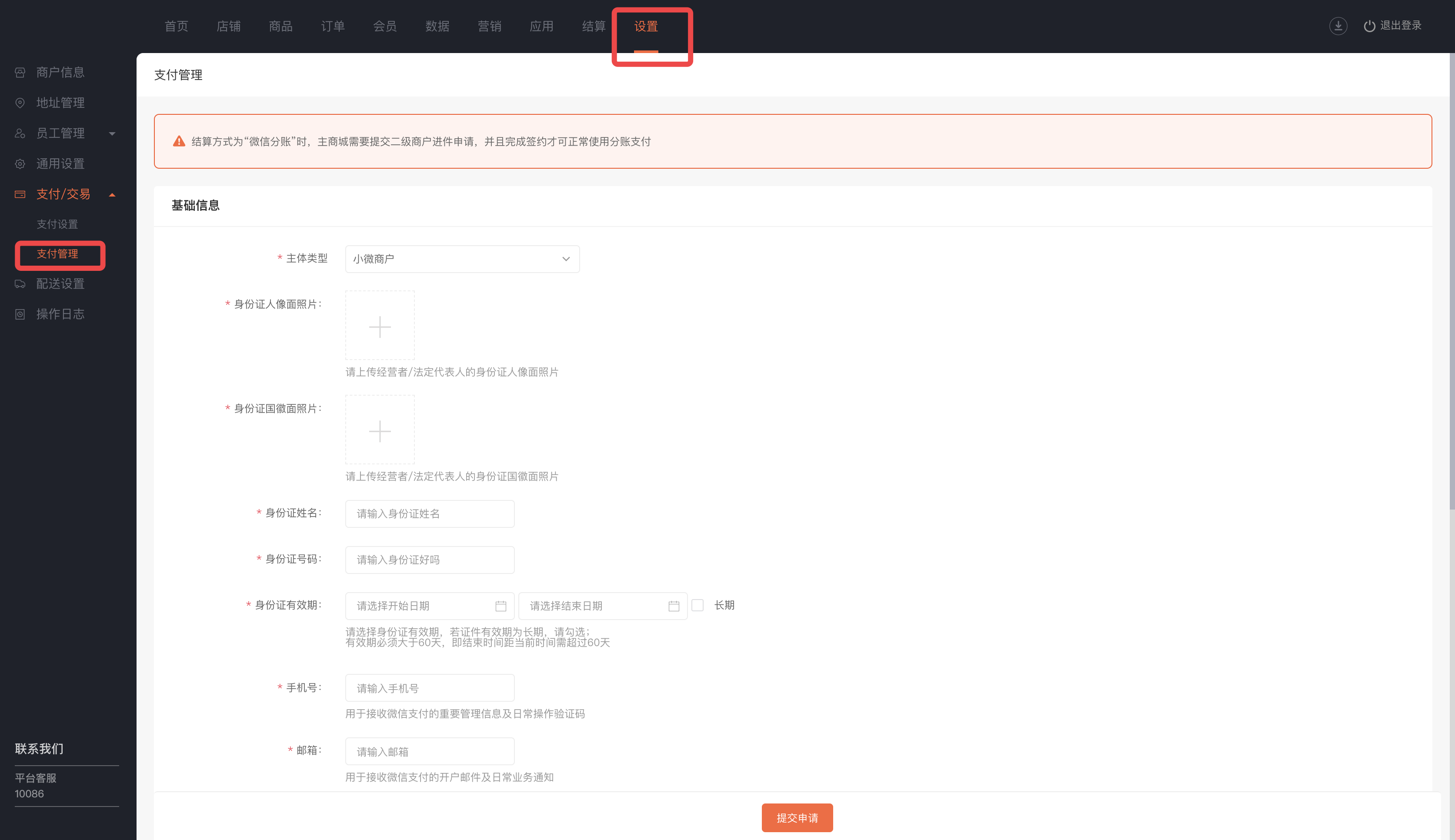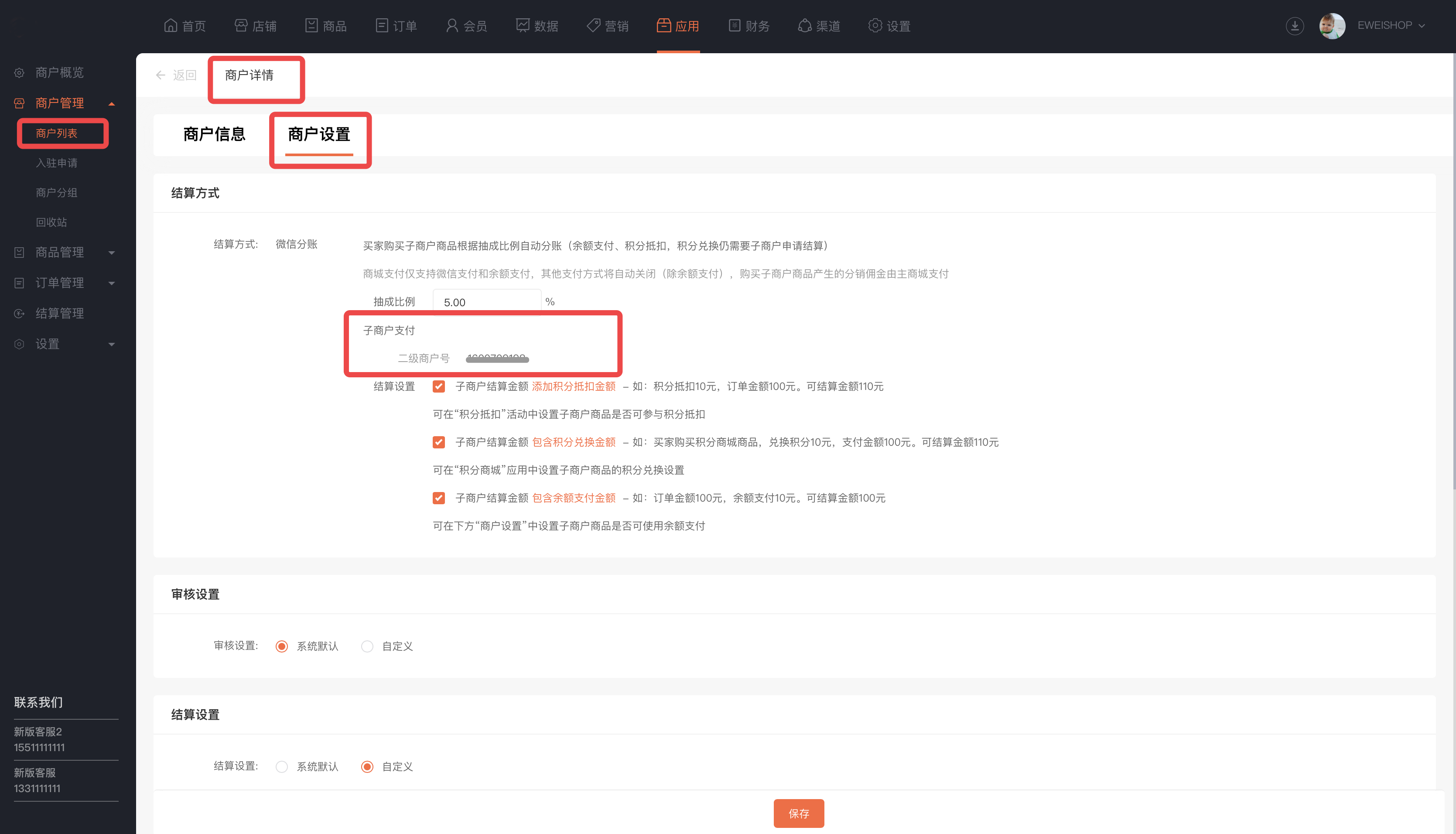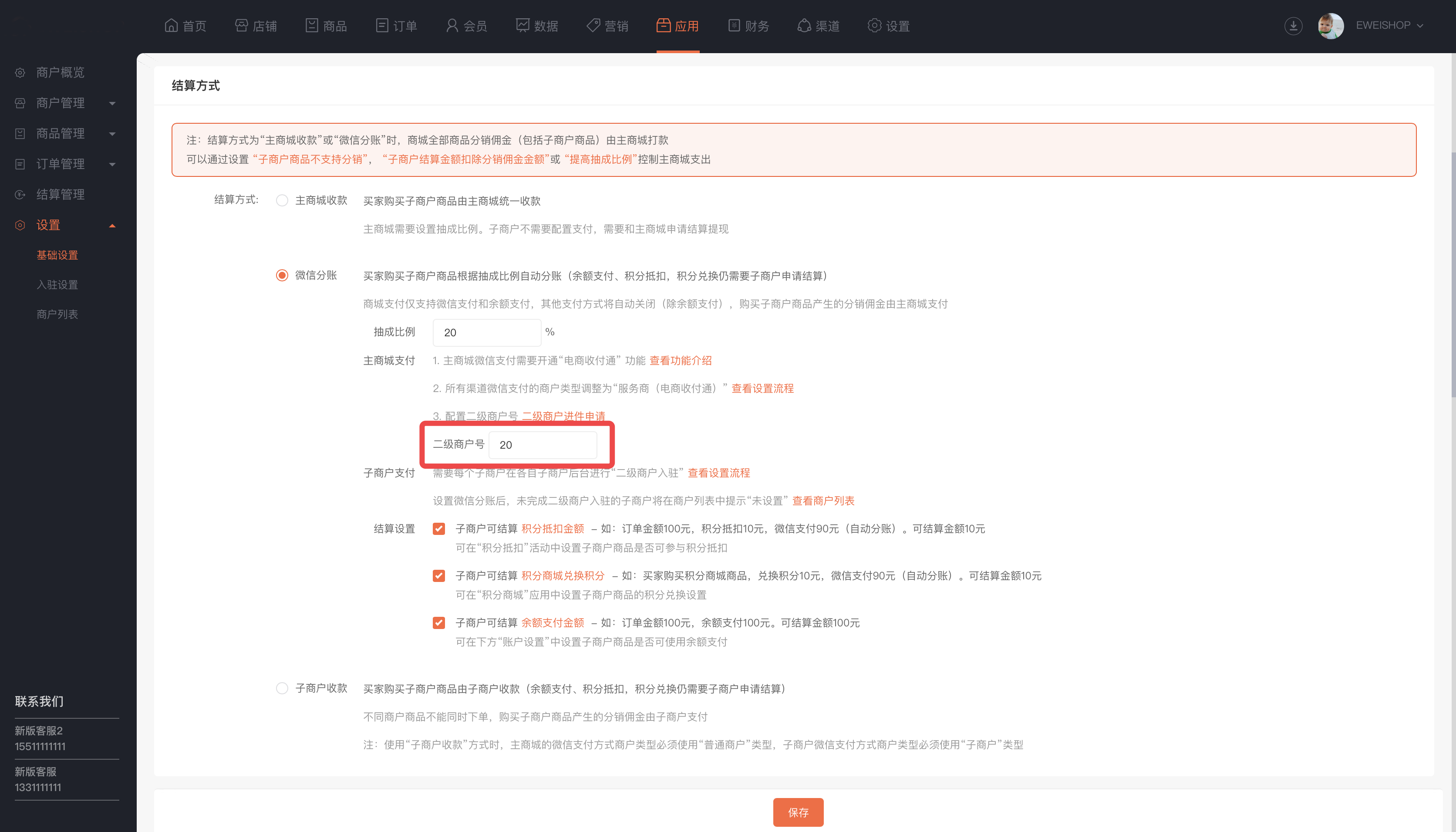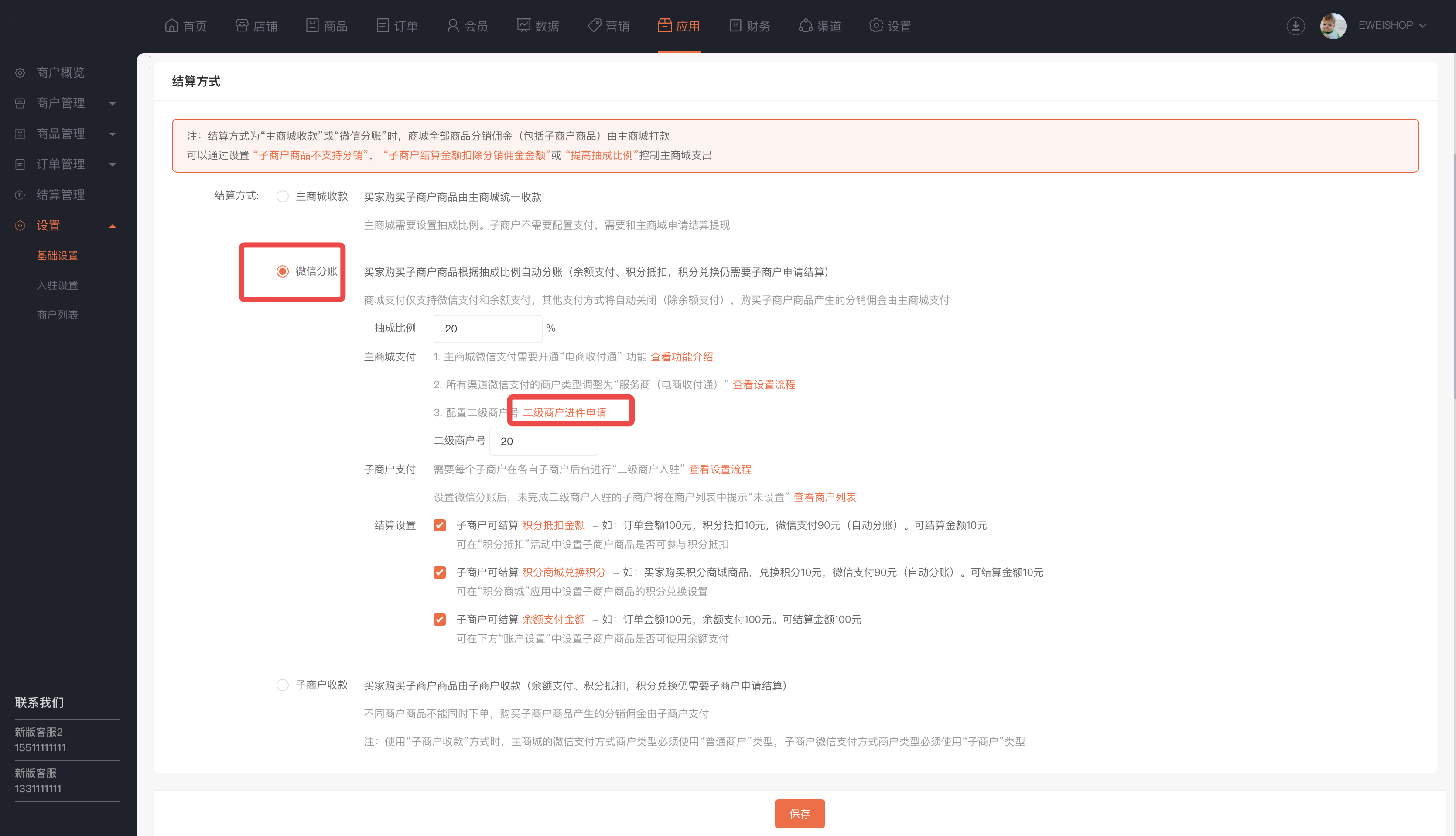 路径:应用 - 多商户 - 基础设置 - 结算方式