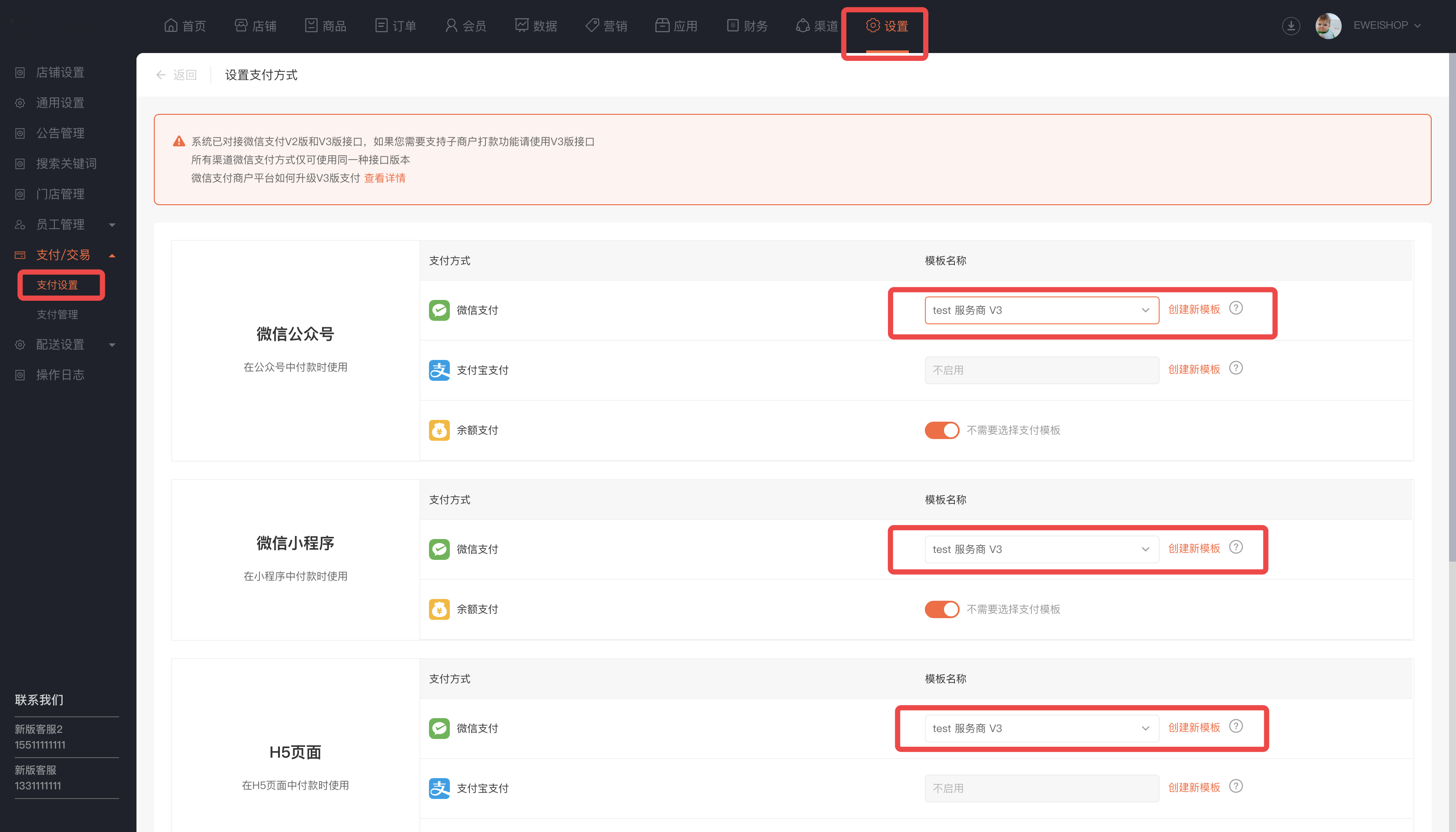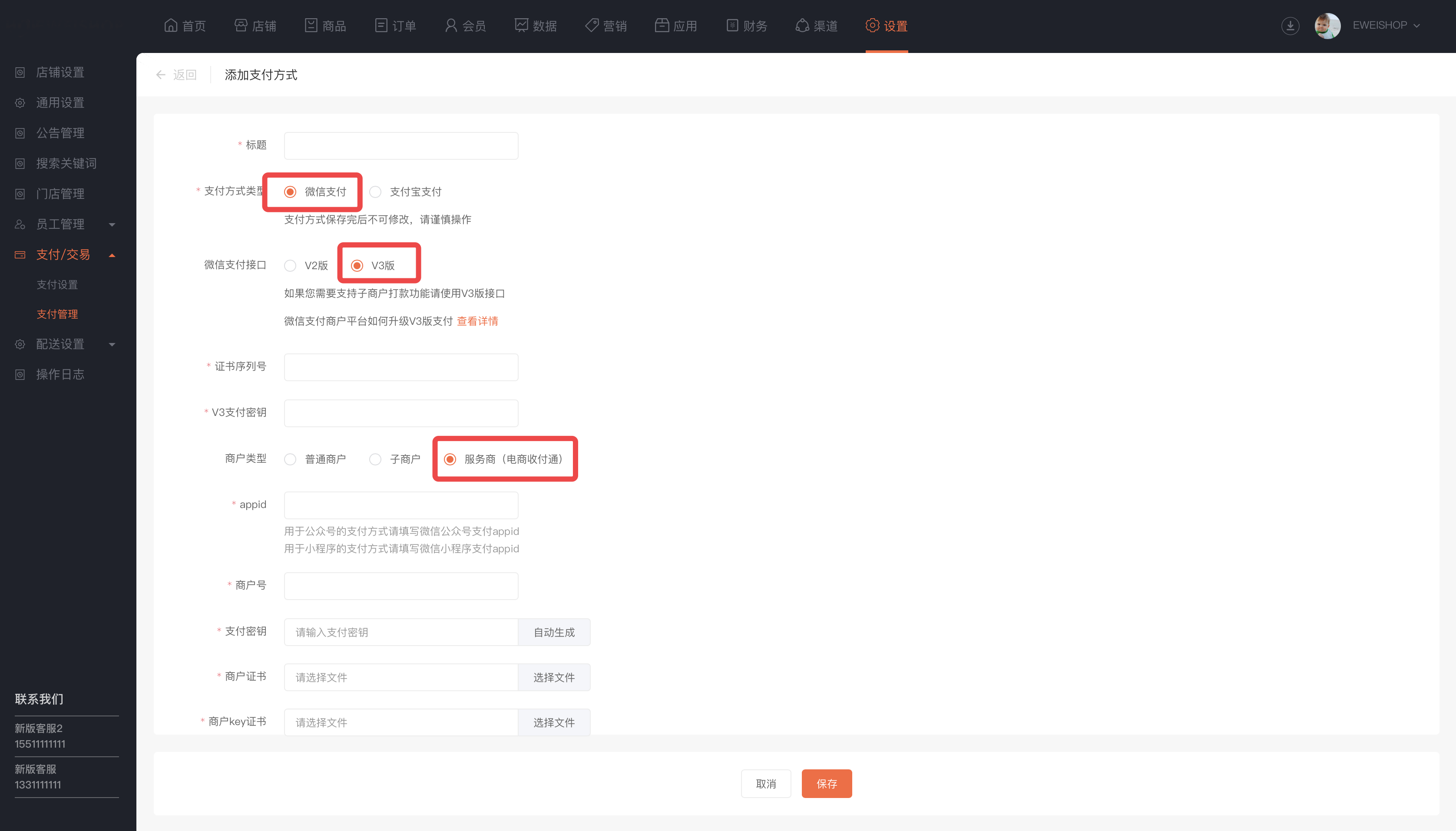 支付方式选择“微信支付”,微信支付接口选择“V3”,商户类型选择“服务商(电商收付通)”