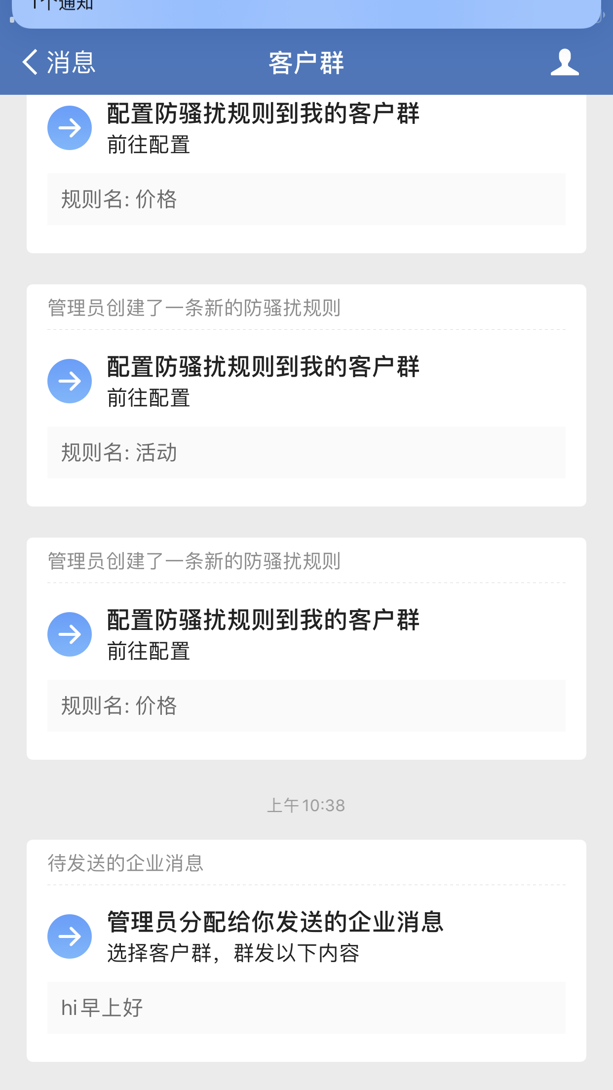 1、每个群聊每个月最多接收来自同一企业的管理员的4条群发消息,到达接收上限后将无法给该群聊推送消息