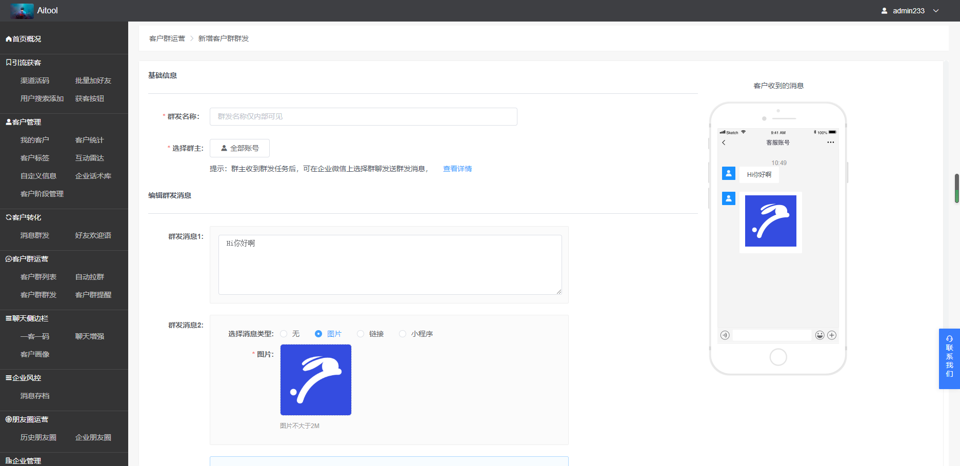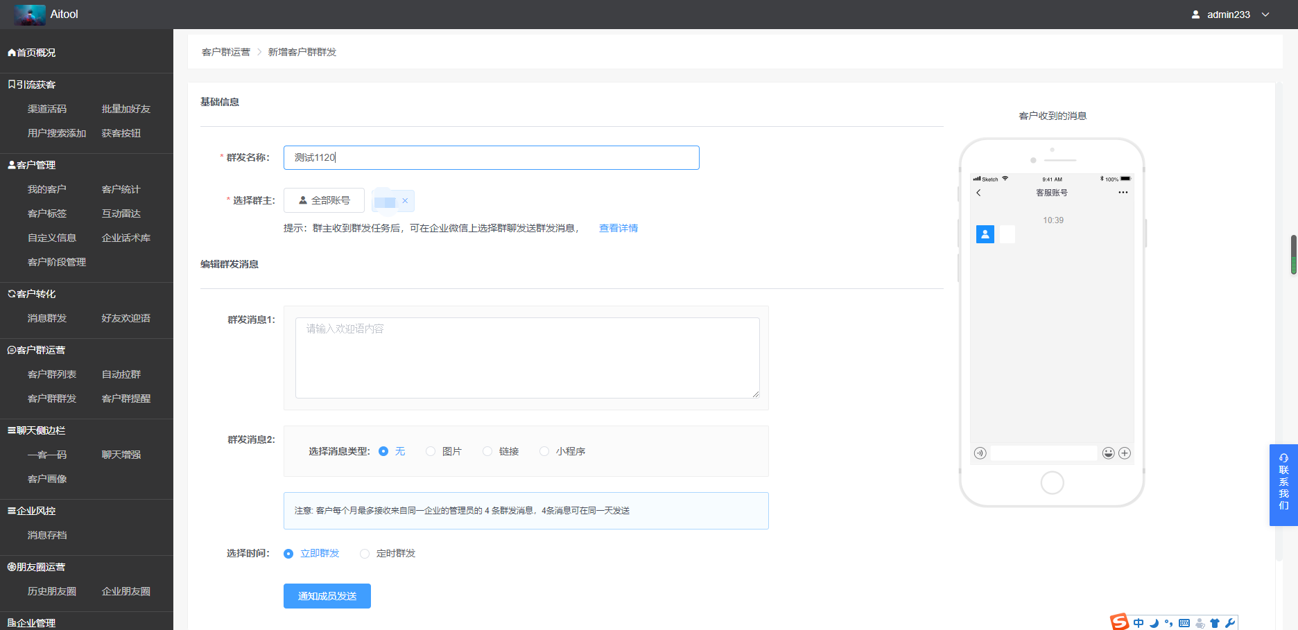 拥有AITool「管理员」及以上权限的成员可向普通员工的客户群创建群发消息;