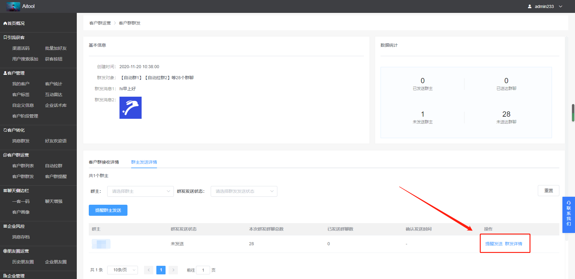 6、管理员可在AItool后台客户群群发列表点击“详情”,查看群发数据。 对于长时间没发送的员工,可点击【提醒发送】,提醒群主发送到客户群
