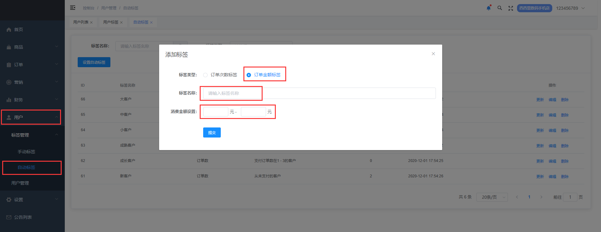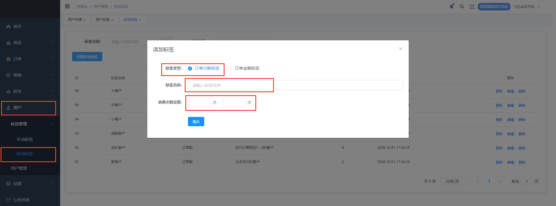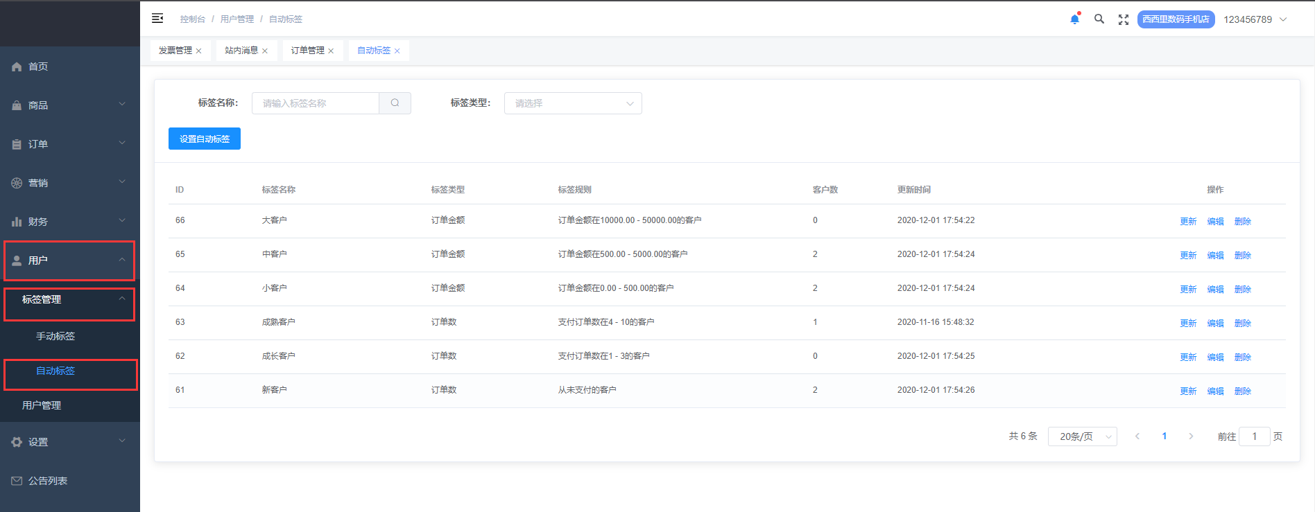 1.先设置自动标签条件规则,设置好后,用户会根据标签条件自动带标签,自动标签类别包括消费订单次数和订单金额;