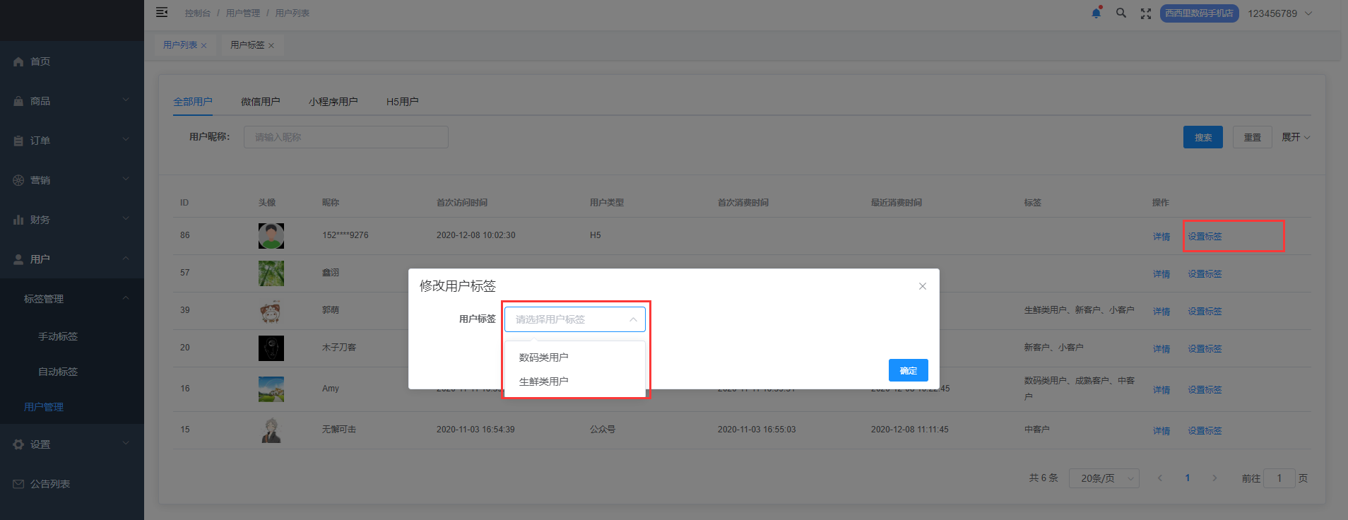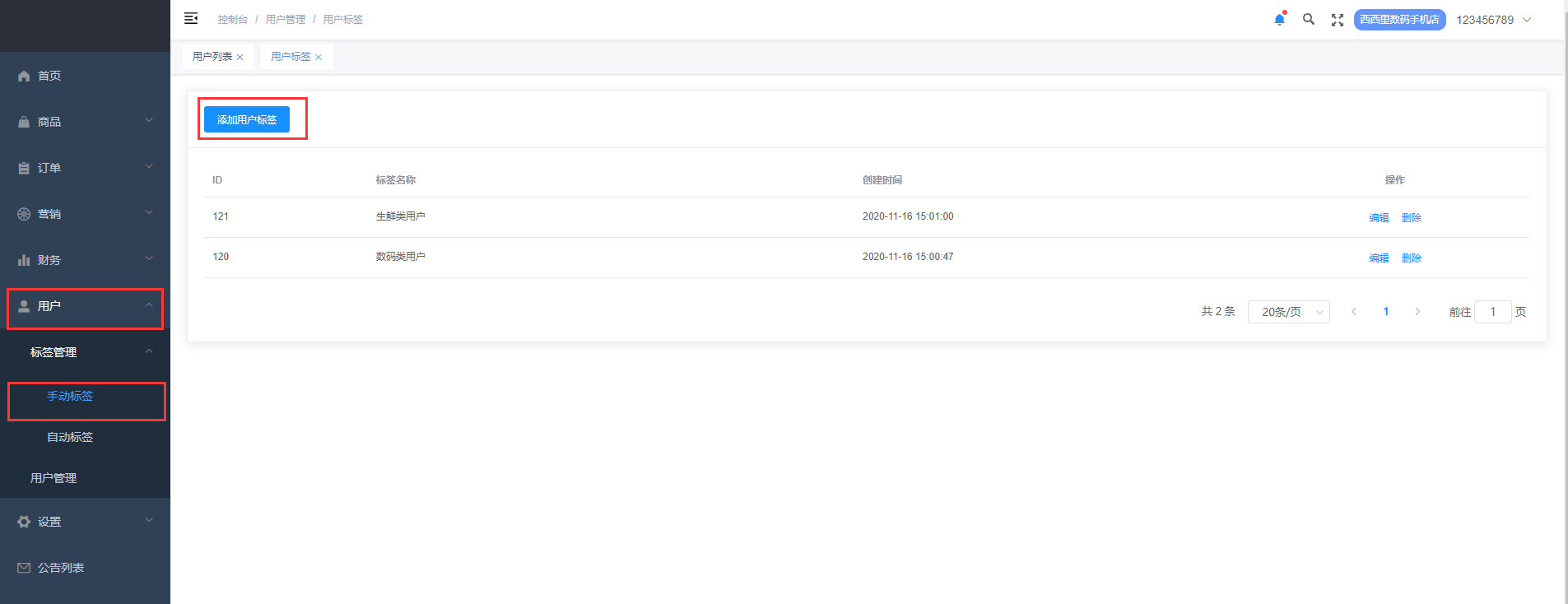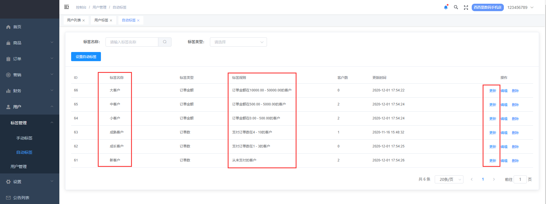 1.先设置自动标签条件规则,设置好后,用户会根据标签条件自动带标签,自动标签类别包括消费订单次数和订单金额;