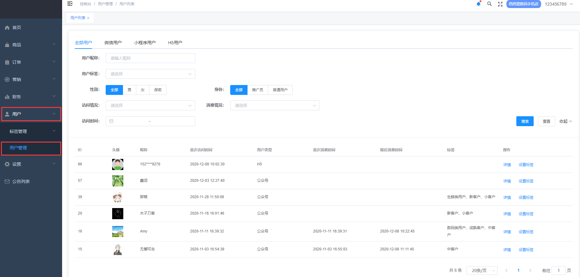 用户关注店铺或在商户店铺下单后,用户信息会展示在商户后台
