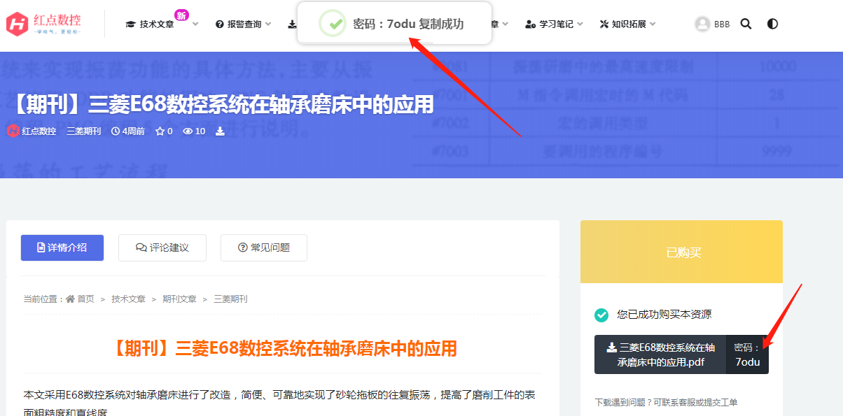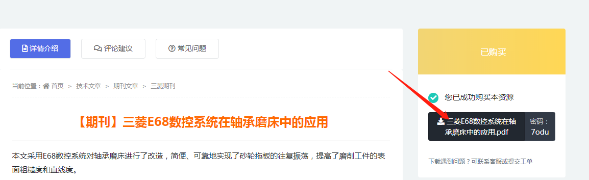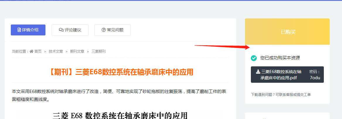 扫码支付成功后,系统显示购买成功,右侧边下载栏显示已购买,并出现下载链接与密码;