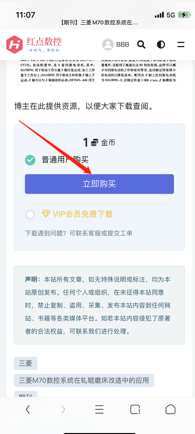 使用手机登录红点数控网站,需要购买相关文章时,在相关文章页面底部,有文章的价格,点击“立即购买”;