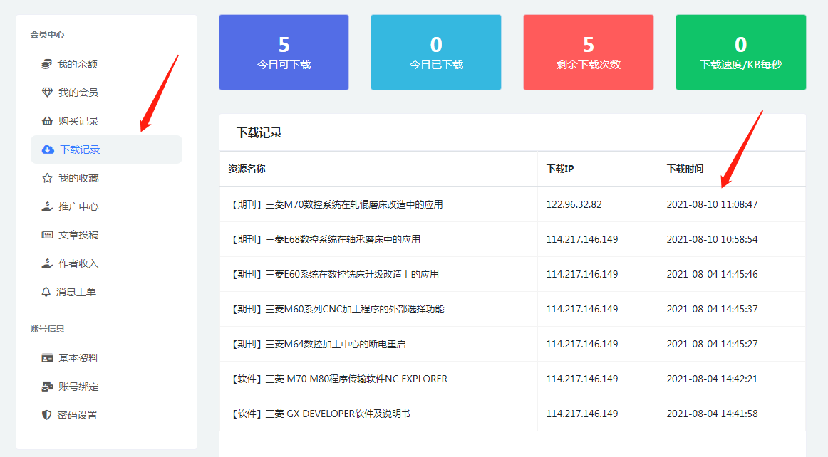 >[danger]查看下载记录 可在个人中心 → 下载记录中查询到最近的下载记录信息; :-: