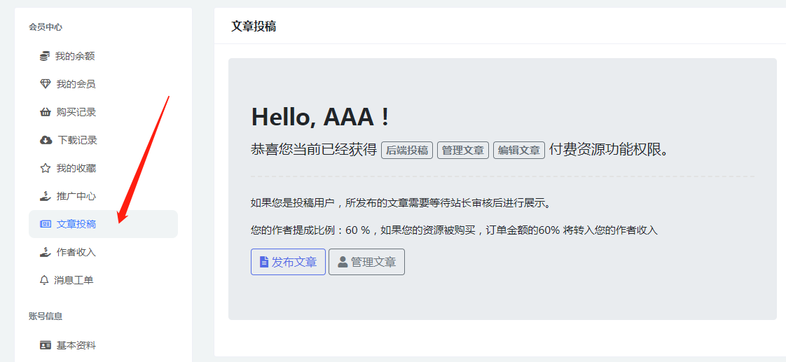2. 在个人中心页面,选择文章投稿,即可进入投稿页面。