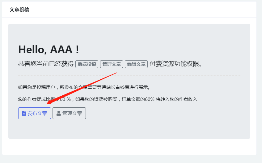 在文章投稿页面,直接点击“发布文章”,系统会直接进入到编辑文章界面;