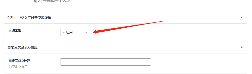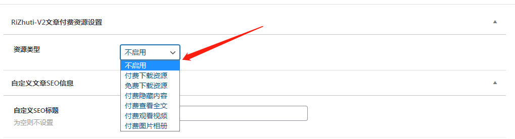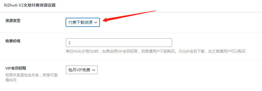 编辑文章页面下方,可以设定文章的资源类型,可分为付费下载资源、付费隐藏内容等,其中最常用的为免费文章、付费下载文章、免费下载文章、付费隐藏内容这几类;