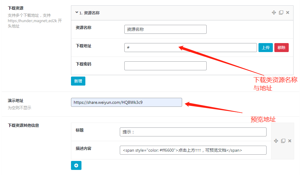 选择完资源类型后,在文章底部下载资源一栏中,填写资源名称与下载链接;