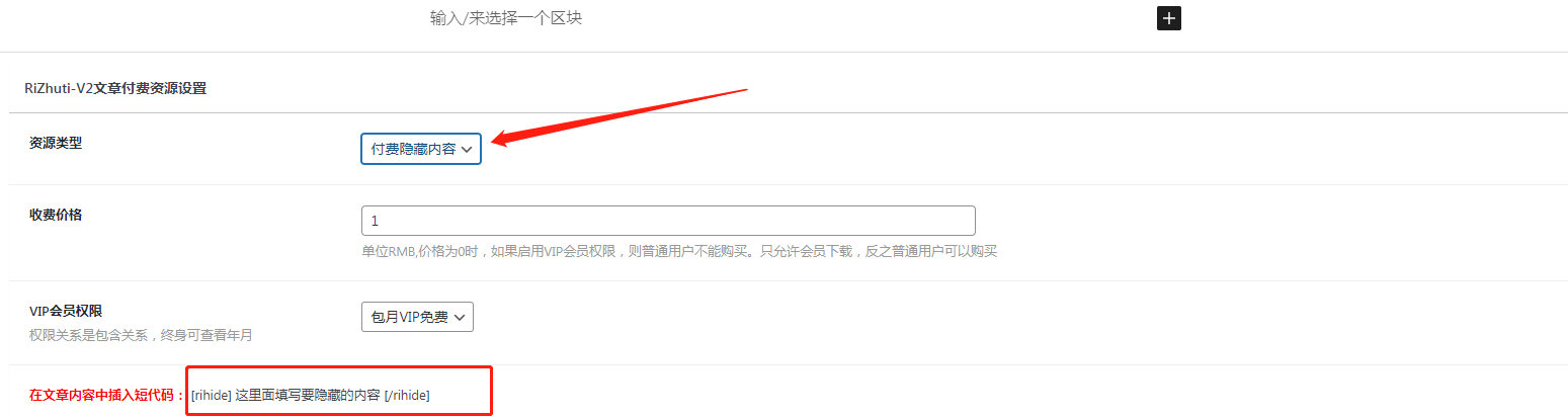 编辑完文章后,在文章底部“资源类型”选择“付费隐藏内容”,在底部复制需要的短代码,“[rihide]与[/rihide]”;