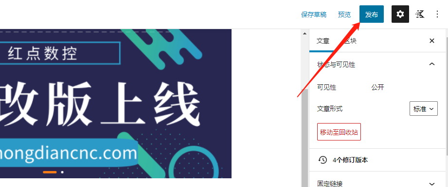 文章编辑结束并完成上述设定,可通过页面右上方“发布”按钮进行文章发布,发布文章后,待管理员审核通过,文章就可以显示再红点数控网站了。