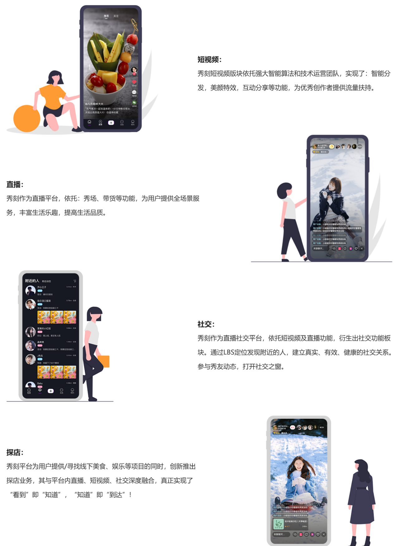 MCN入驻:秀刻短视频板块依托强大智能算法与技术运营团队,拥有社交、探店等多元化功能,具备广 阔的前景,同时坐拥3000万+活跃用户,如果您旗下有优质的资源,秀刻ShowLike+诚挚邀请您的入驻!公会入驻:在直播成为新时代风口的现在,秀刻作为社交聚合直播+平台,坐拥3000万+活跃用户,覆盖 短视频、直播、社交、探店等多种元素,充分满足用户的多种需求,借助用户打造口碑,形成平台的良性 循环。如果您旗下有优质的艺人和主播资源、优质节目内容等,秀刻ShowLike+欢迎您的加入!