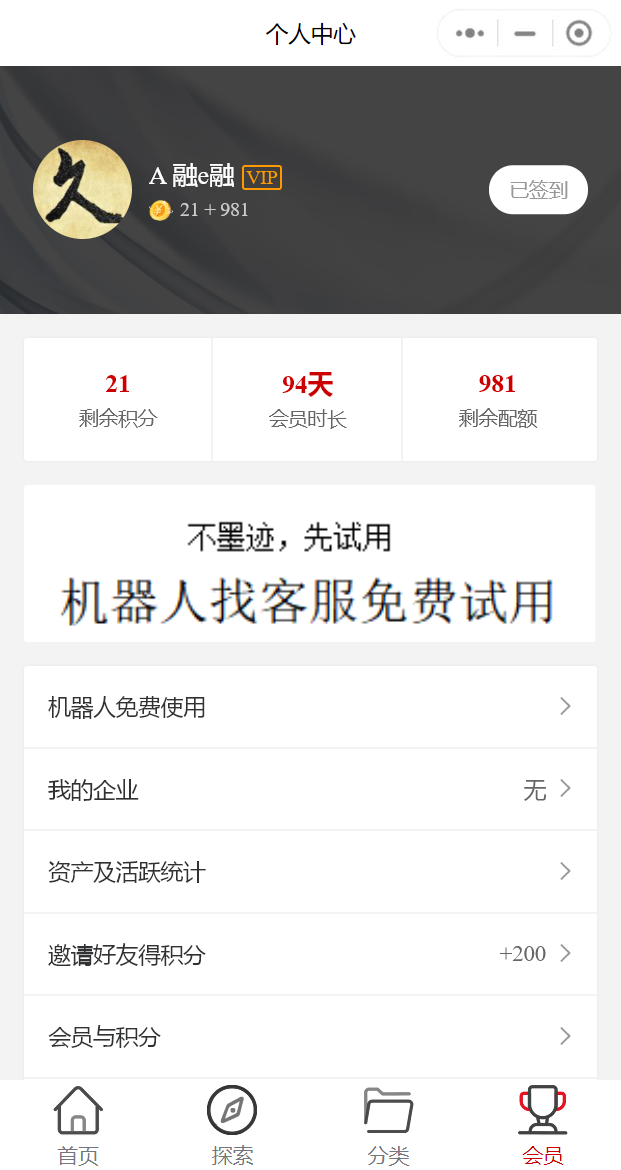 1.我这显示剩余积分21, 会员市场94天,剩余配额981