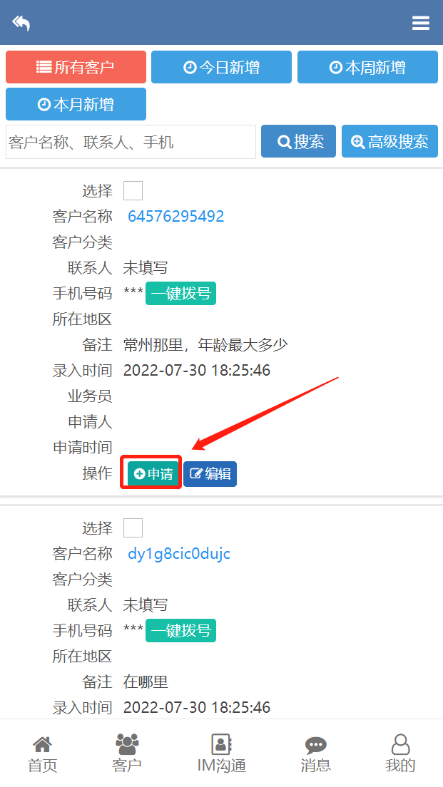4.步骤3点击申请后,这个就在最下面的客户里面看到了。这个时候说明客户只有你可以看到了