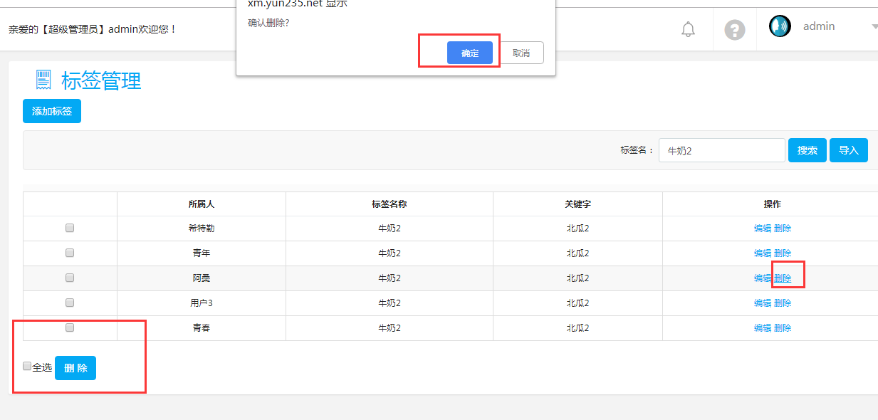如下图:点击列表行右边的“删除”关键字,或者 点击列表行右边的复选框,或点击表格左下边的全选复选框后点击“删除”按钮,弹出确认删除框,点击确认即可删除,如果不删除,点击取消即可。