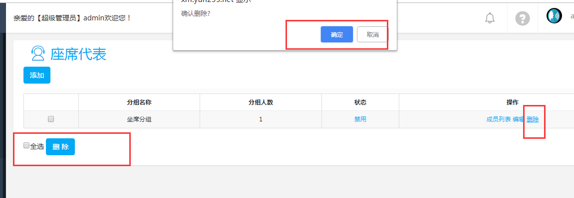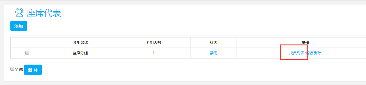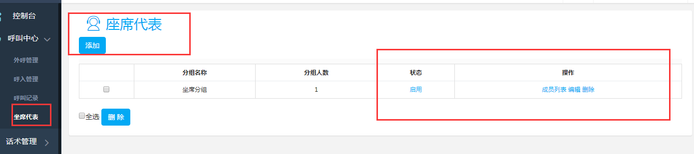 右侧菜单-座席代表,点击进入座席代表管理界面,左上是“添加”座席按钮,列表的右边是对该座席的各种操作,点击状态列的“启用”或“禁用”关键字可以修改状态,列表的下面是批量删除按钮,可以选择后批量删除。