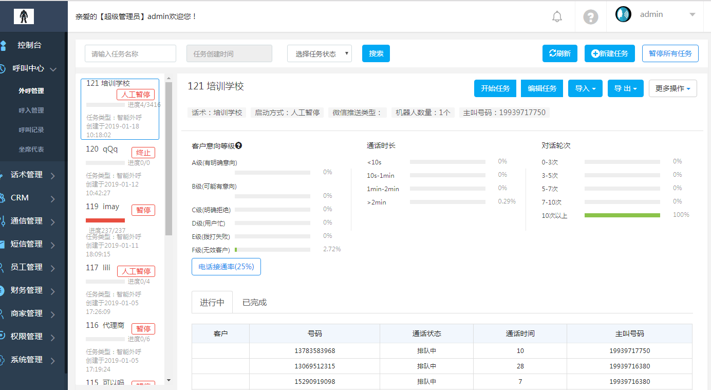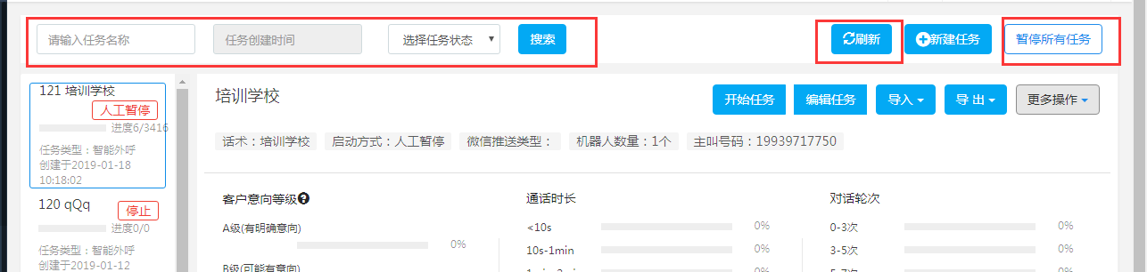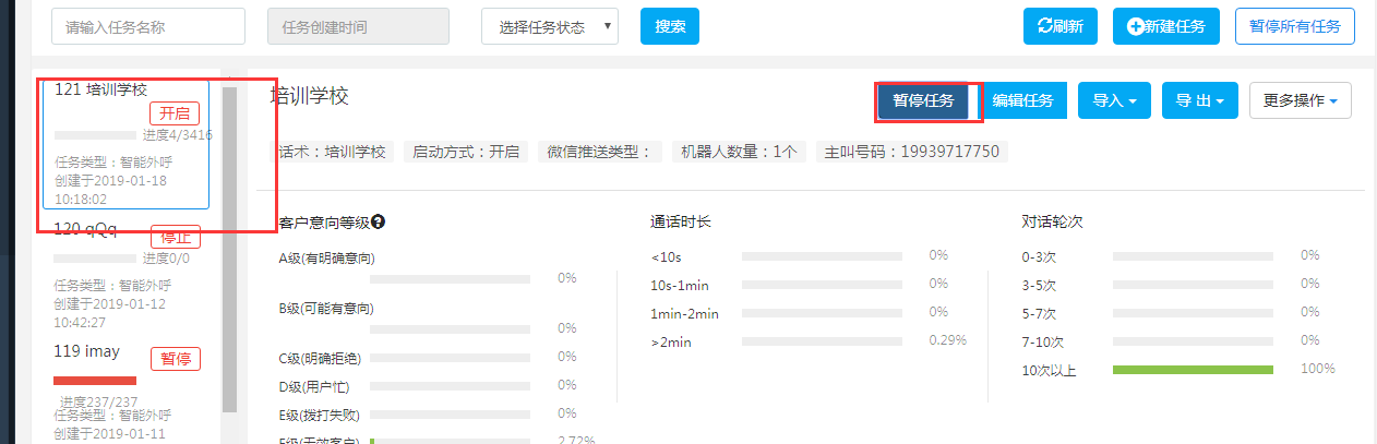 看这个界面,上面是一些功能按钮,左边是任务列表,可以选择任务做各种查看和改动,右边是当前任务的详细信息,右下边可以看到已完成和未完成的拨打对象。
