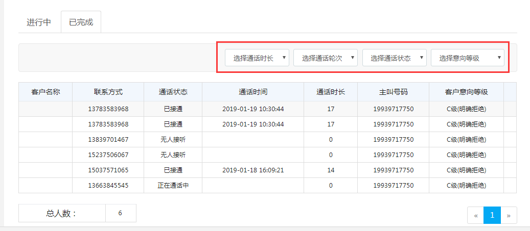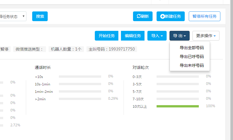 如下图,点击“导出”下拉按钮,根据您的需求导出不同的拨打对象。
