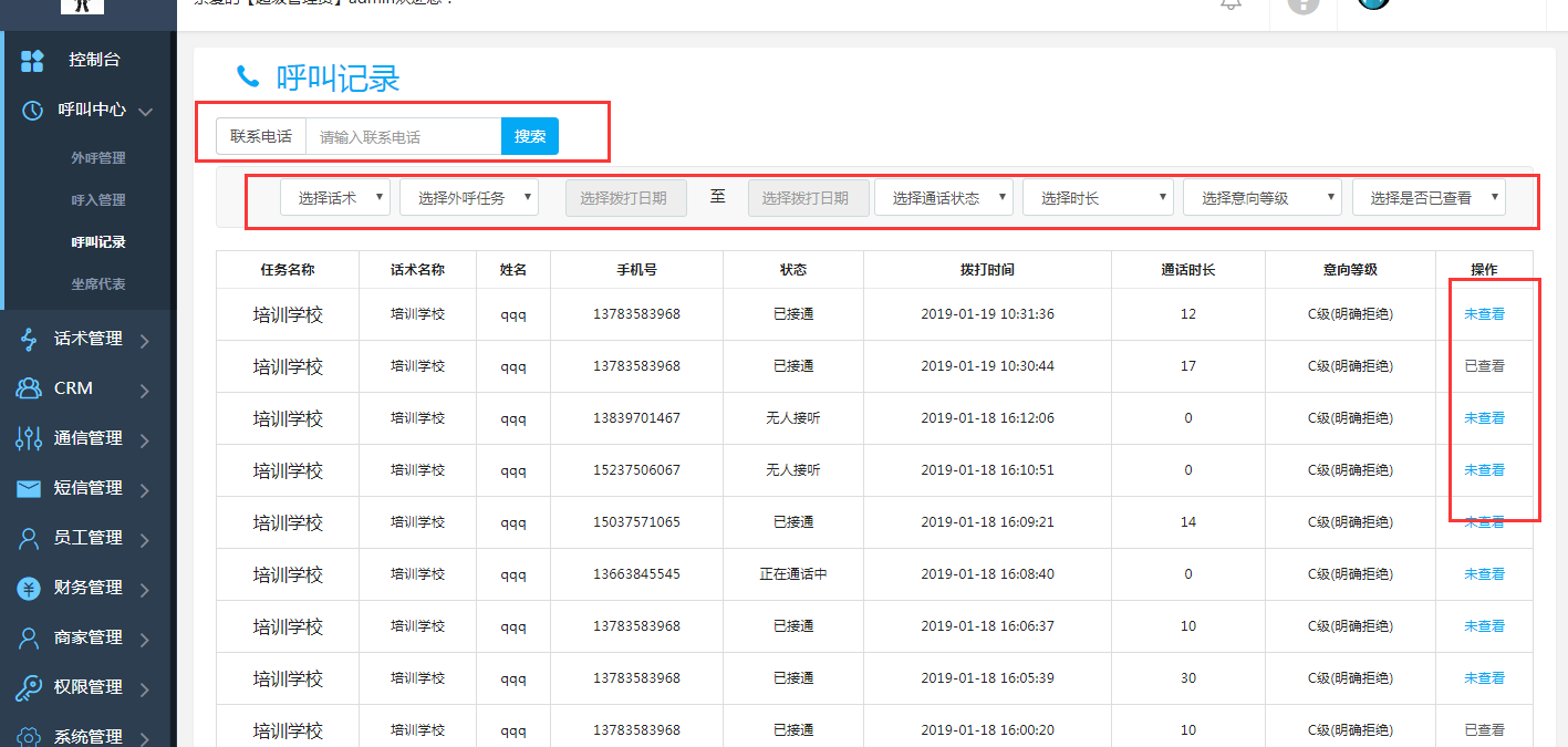 右侧菜单-呼叫记录,点击进入呼叫记录界面,左上是根据联系电话进行的精确查找操作按钮,列表上面查找记录的条件,可根据条件查找记录。列表的右边是查看拨打记录。