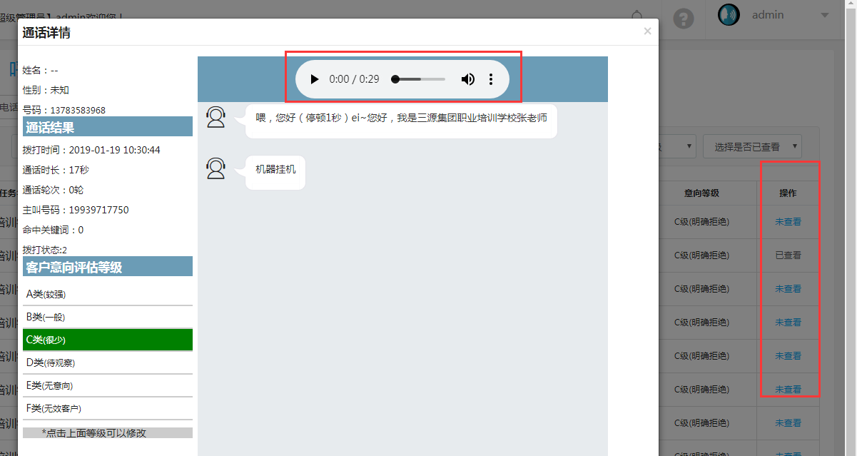如下图:点击列表右边的“未查看”或“已查看”弹出通话详细窗口,查看通话详情,可以点击上面的控件,播放录音。