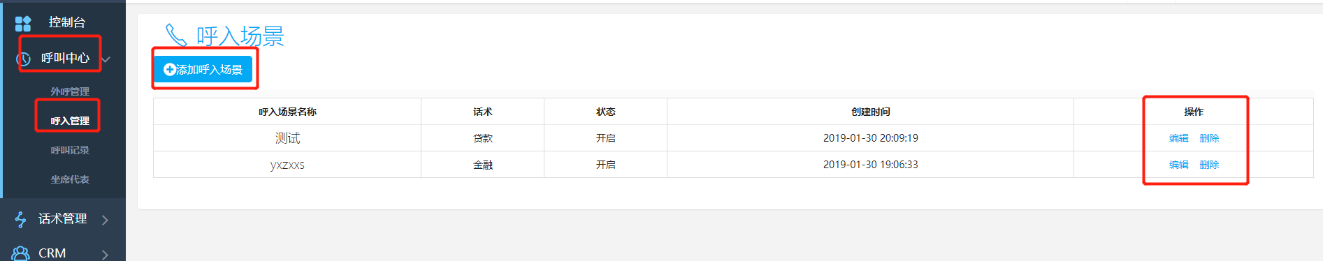 右侧菜单-呼入管理,点击进入呼入场景管理界面,左上是“添加呼入场景”按钮,列表的右边是对该记录的各种操作