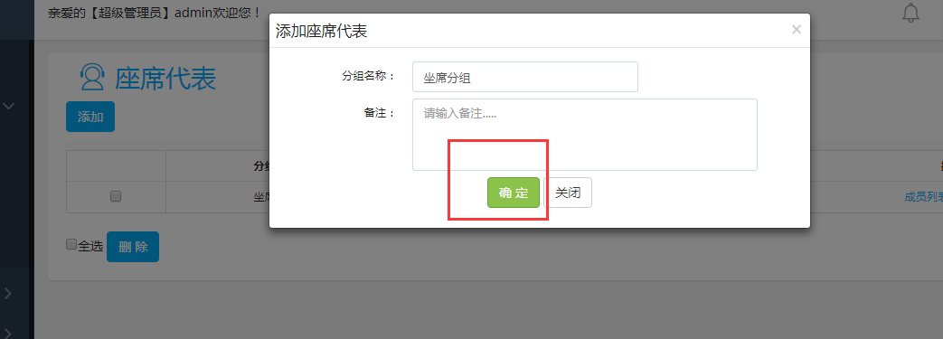3)例如:添加成员,如下图:点击右上角的“添加”按钮,弹出添加框,选择“类型”和“用户列表”后点击“确定”按钮即可。