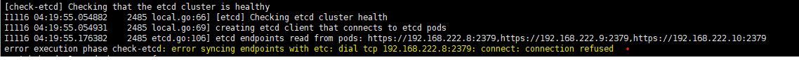 error execution phase check-etcd: error syncing endpoints with etc: dial tcp 192.168.222.8:2379: connect: connection refused