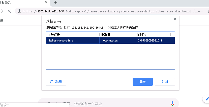 将生成的`kubecfg.p12`到处浏览器 导入完成后,重新打开浏览器
