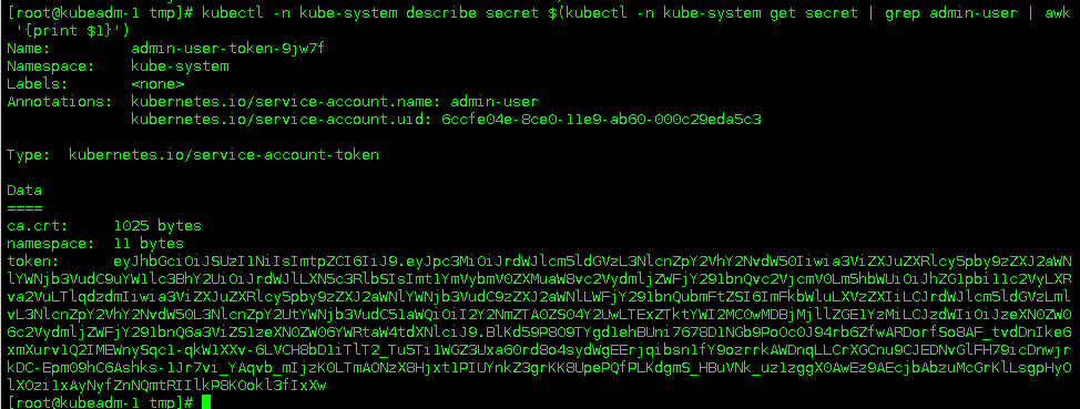 kubectl -n kube-system describe secret $(kubectl -n kube-system get secret | grep admin-user | awk '{print $1}')