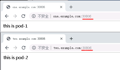 * 接着在ingress类型yaml中,在字段`rules`中,分别定义两个host:`one.example.com`和`two.example.com`,最后分别对应不同的后端pod:`pod-1`和`pod-2`
